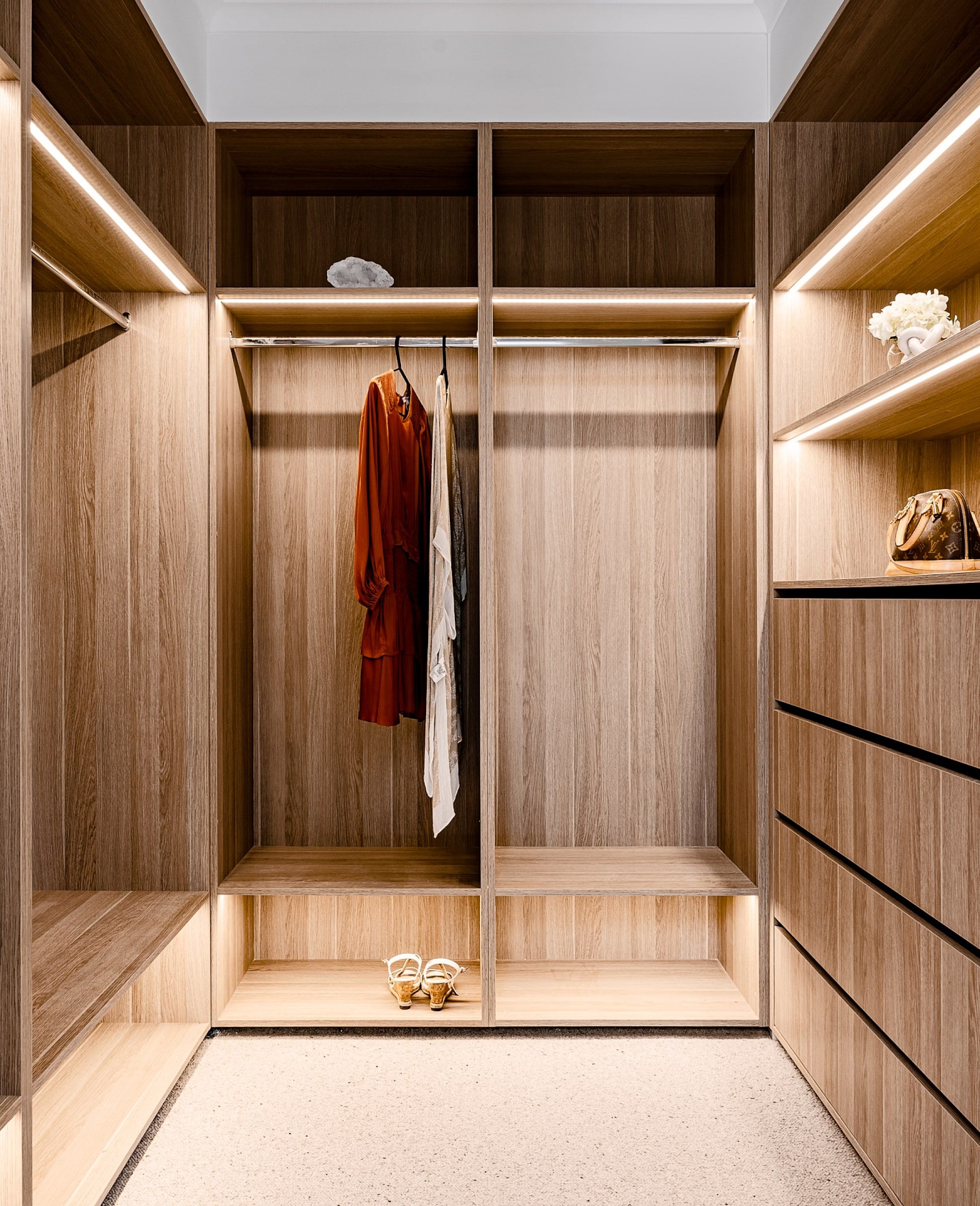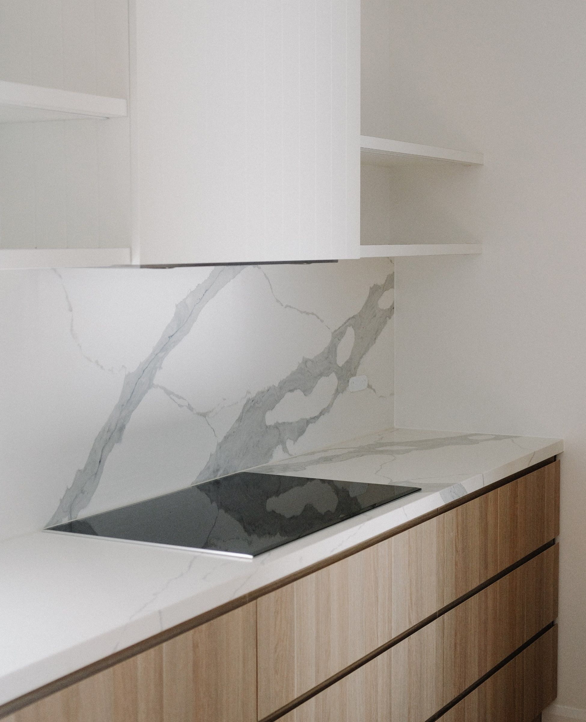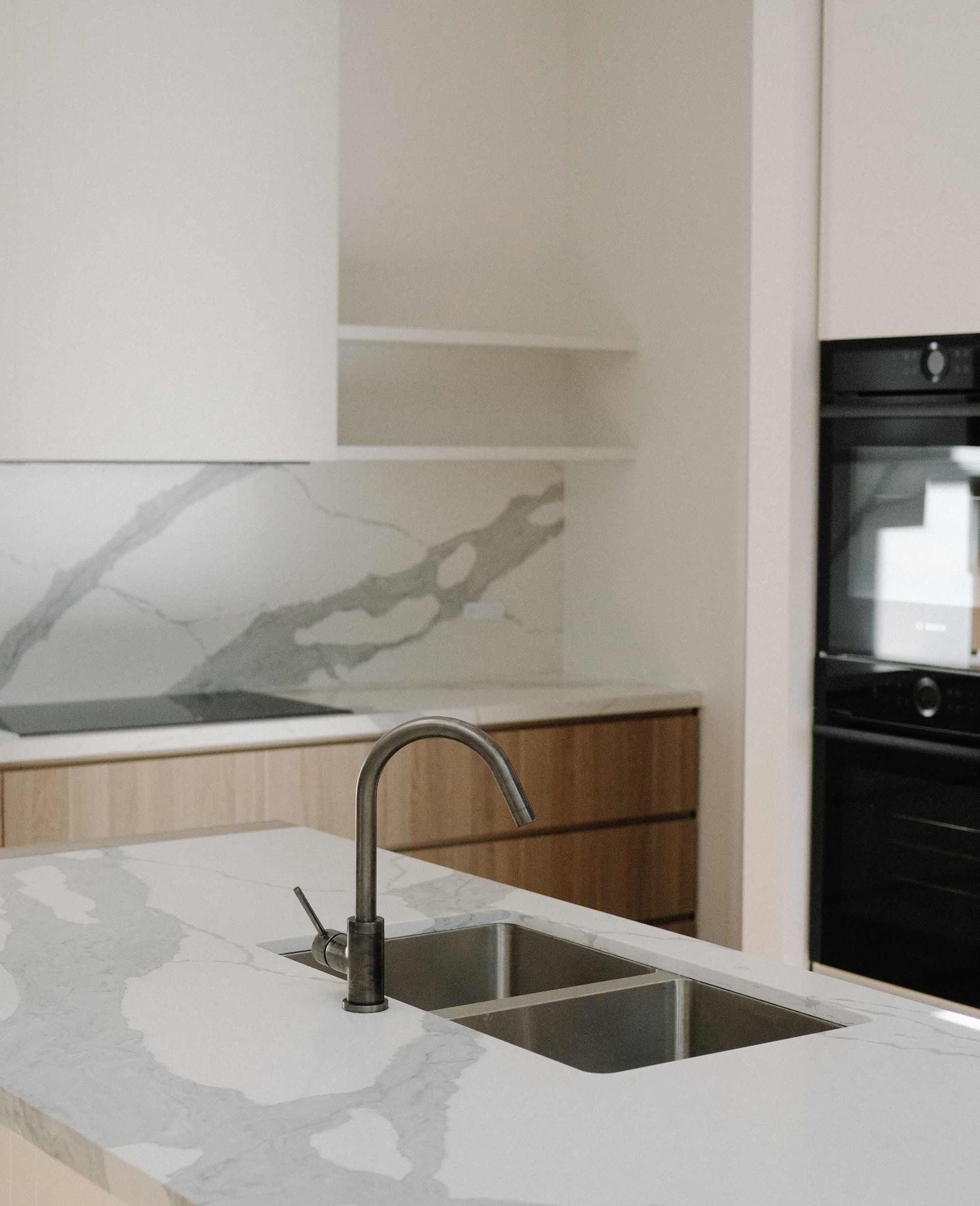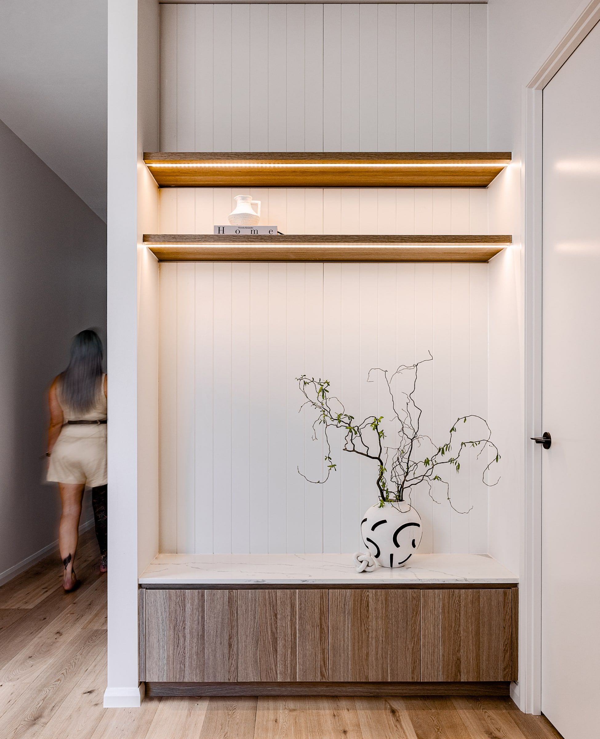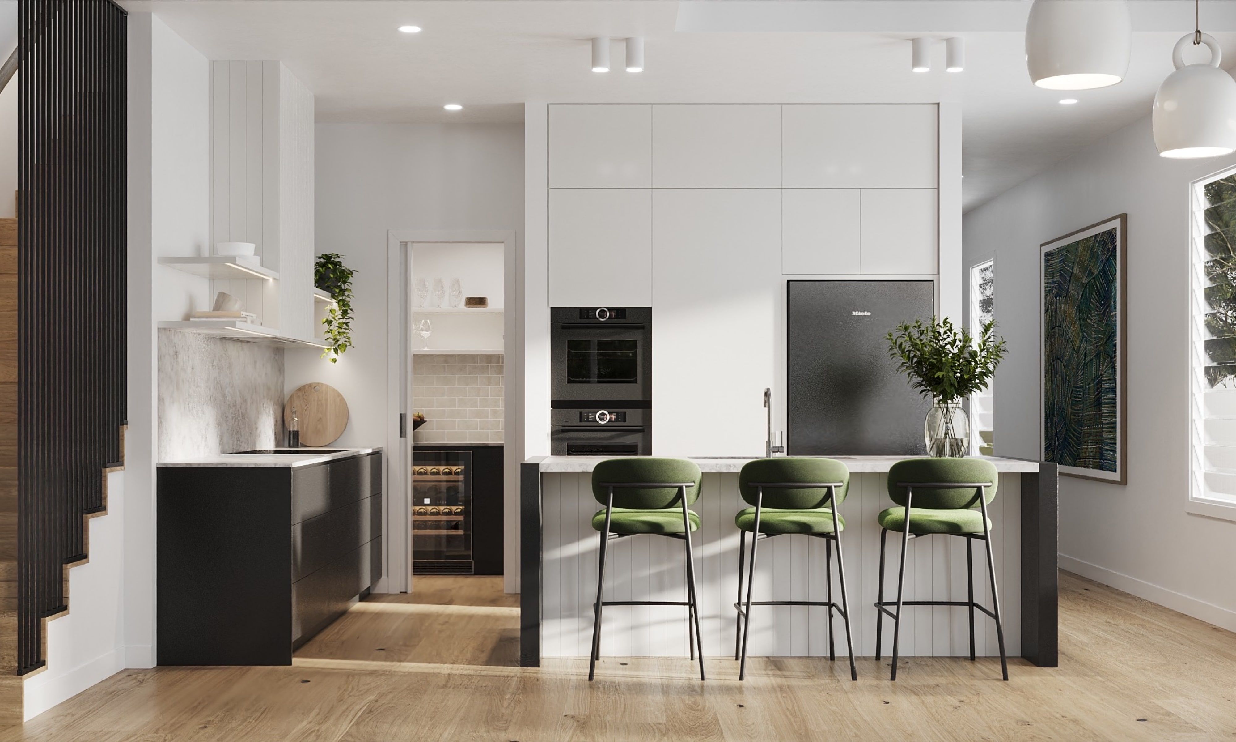 The interiors showcase meticulous attention to detail, with engineered timber floors throughout and full-height cabinetry in the kitchen and living spaces.